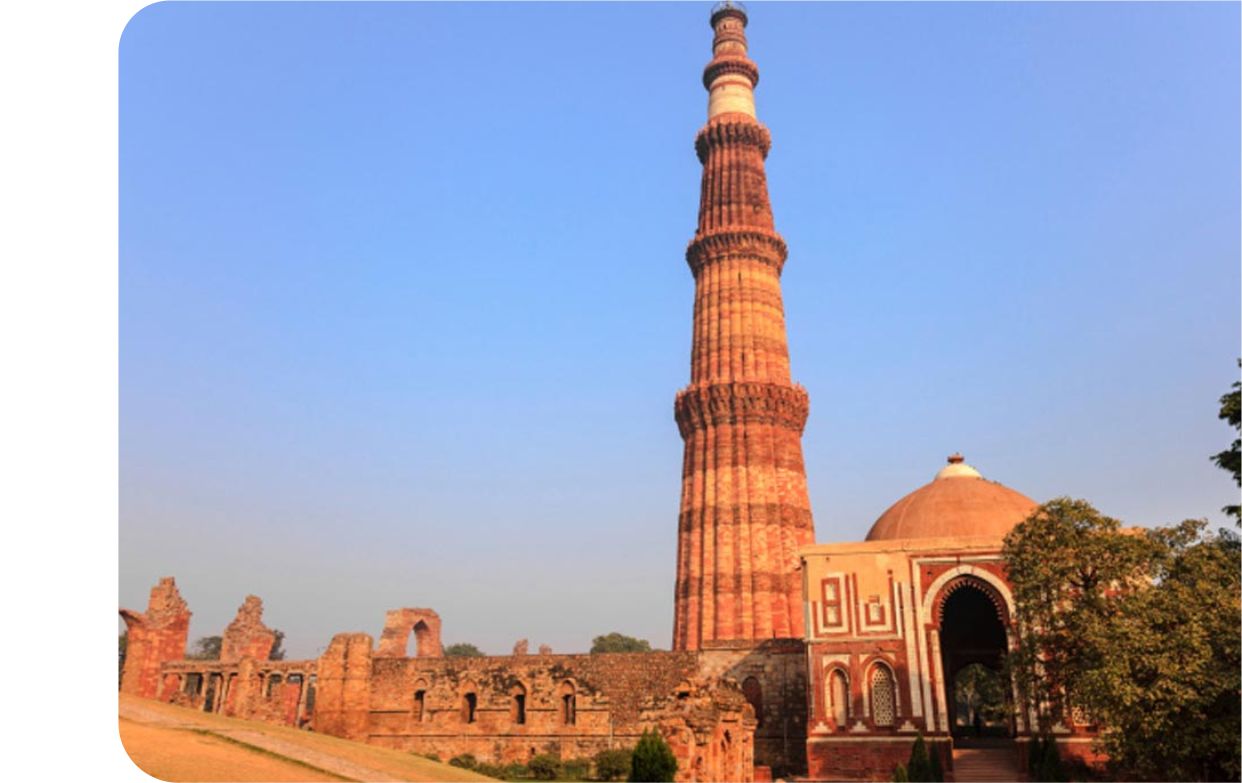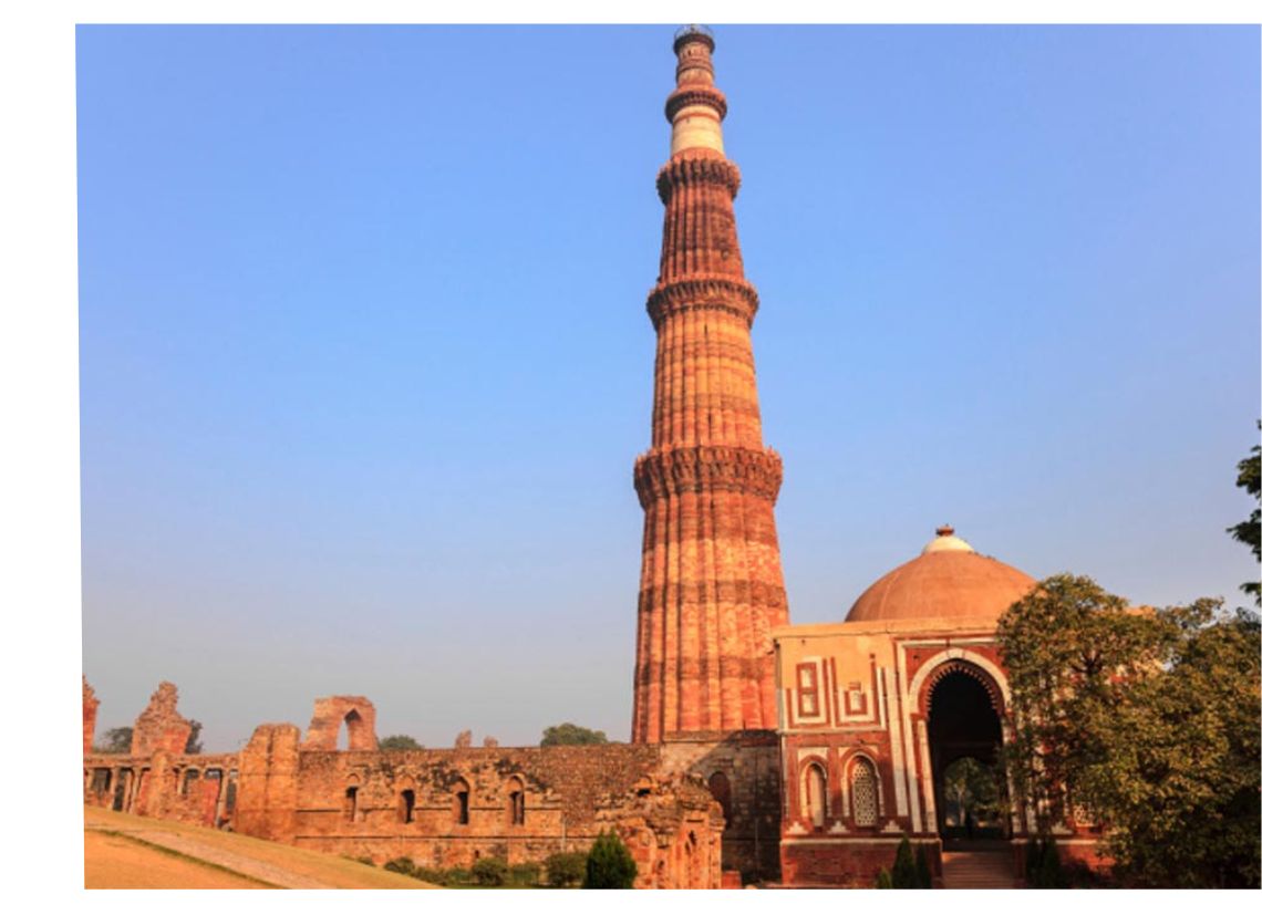 Qutub Minar complex at Mehrauli. Qutub Minar is the tallest stone tower in India and one of the greatest bequests of Islamic culture. This 72.5 metre high tower dates back to the 13th century. At its base lies the Quwwat-ul-Islam mosque, the very first mosque to be built in India. A famous iron pillar of the 5th century stands before it, that has remained rust free for 1500 years!